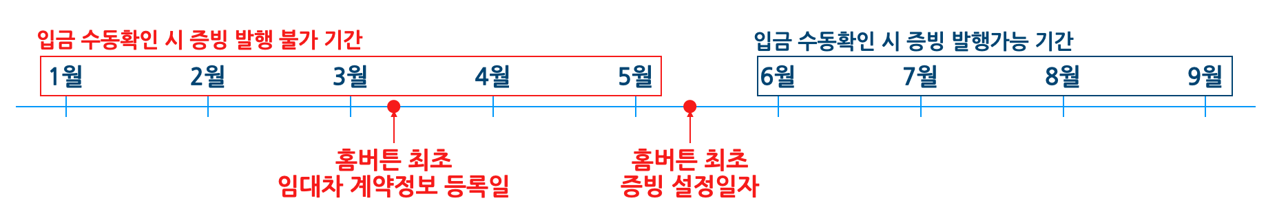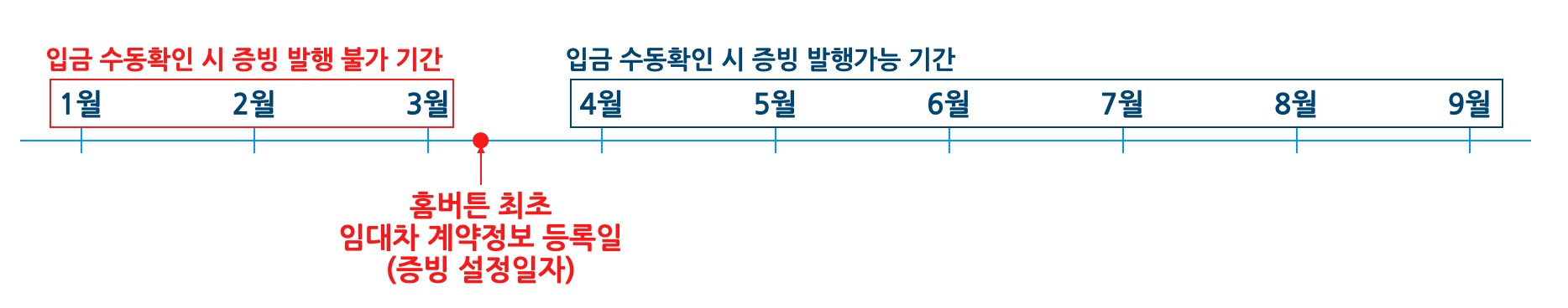 홈버튼에서는 임대차 계약정보 등록 시점 이전 미납내역에 대해서는 증빙 발행이 불가능합니다. 이는 과거 발행내역이 있을 수 있어 중복 발행에 대한 사전 방지 차원입니다.