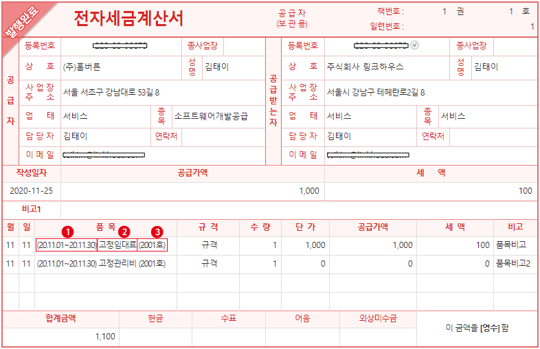 세금계산서 각각의 품목에는 ①기간 / ②항목 / ③호실 순으로 표시됩니다.
