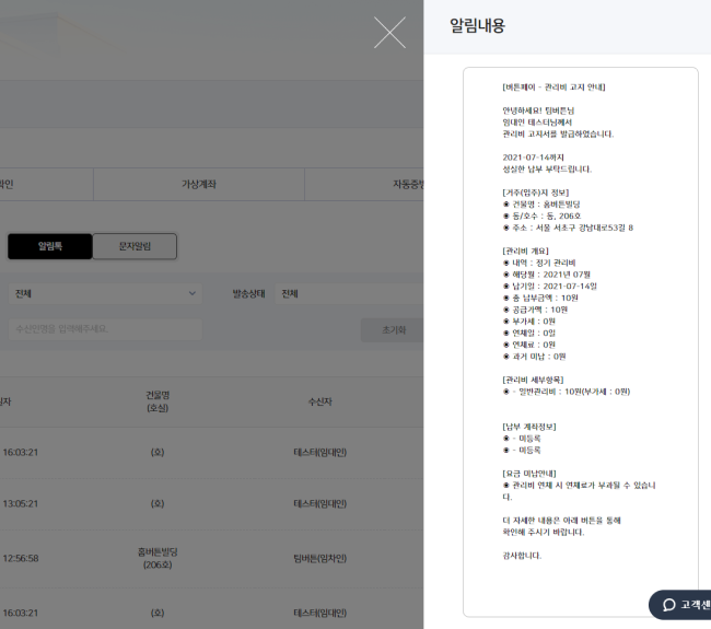 임차인, 메시지 내용과 같은 일부 출력값들은 클릭 시 상세 페이지를 제공합니다.