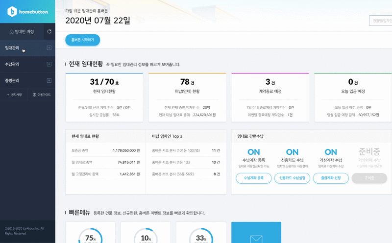 홈버튼에서는 건물별 입금내역을 엑셀로 다운로드 할 수 있습니다.