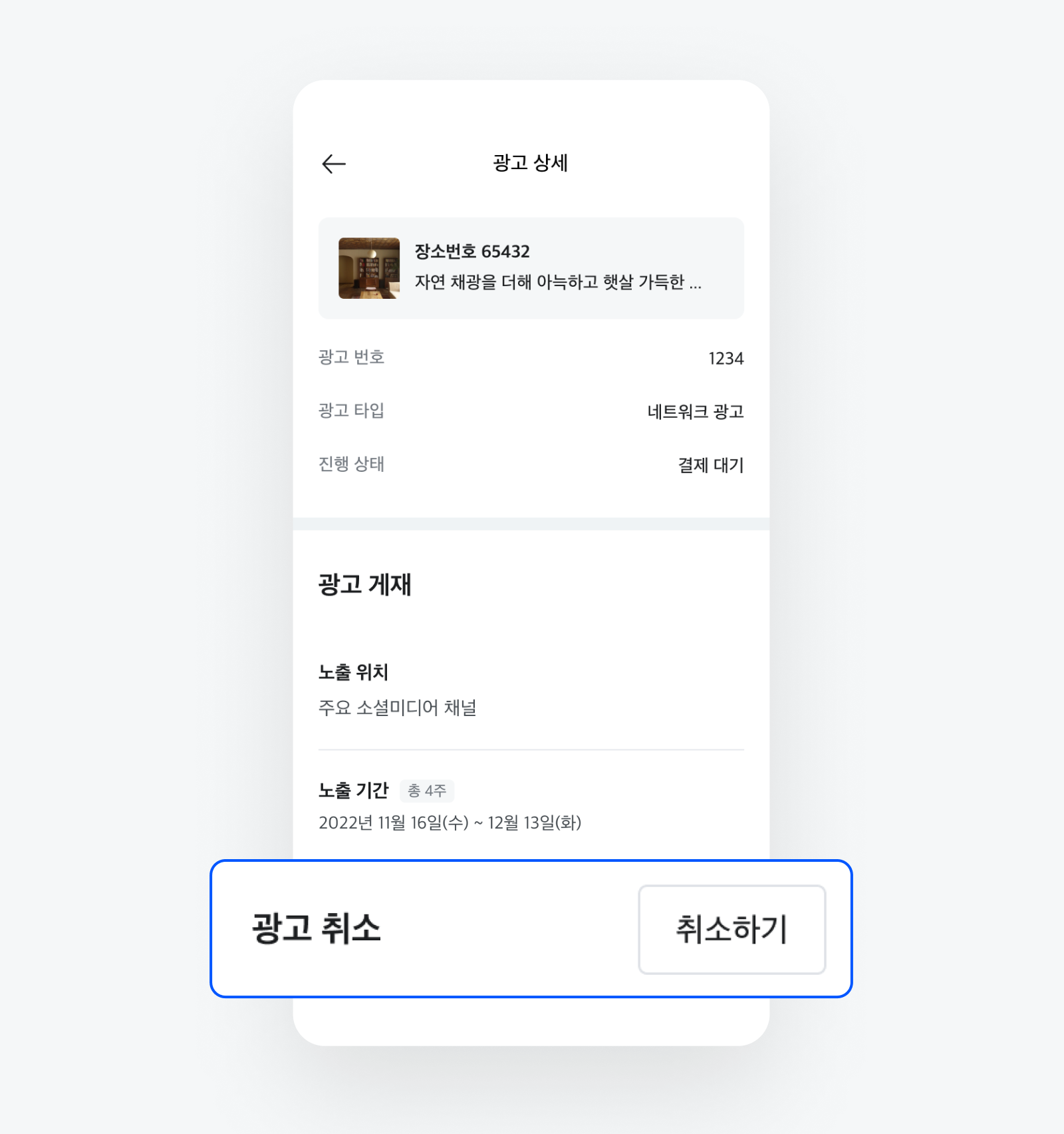 광고 상세 화면 하단의 [광고 취소] > [취소하기] 버튼 선택