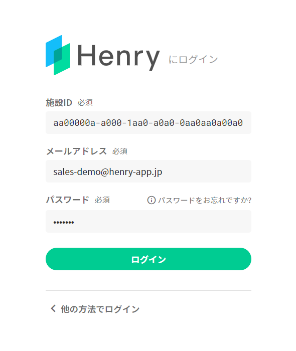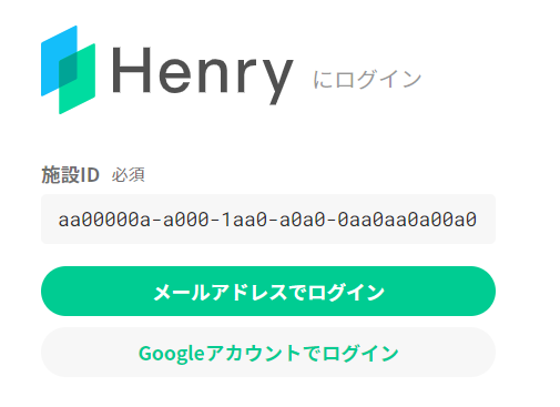 ログイン画面が表示されたら、施設IDを入力し、「メールアドレスでログイン」ボタンを押下します。