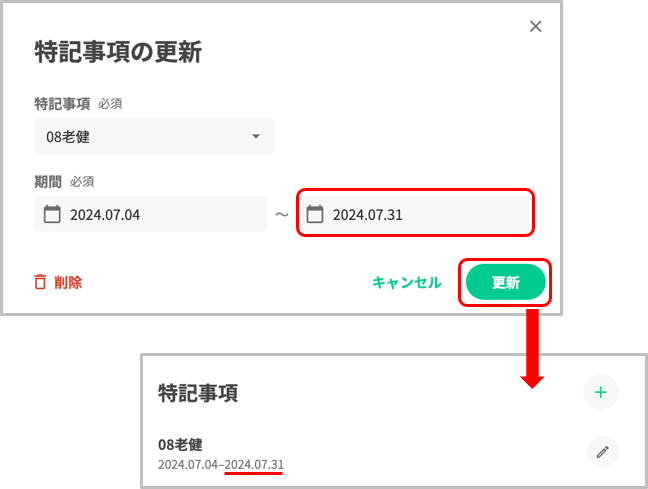 2.内容を修正し「更新」ボタンをクリックすることで特記事項が更新されます。