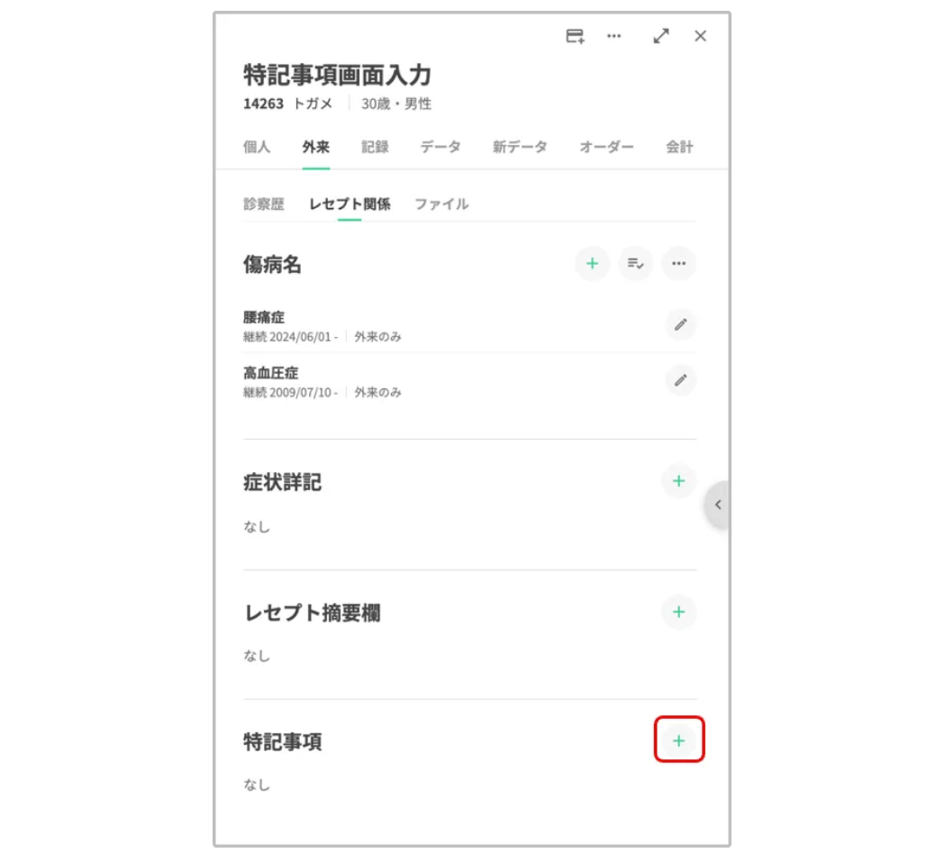 • 患者画面の「外来」-「レセプト関係」-「特記事項」から操作可能です。
