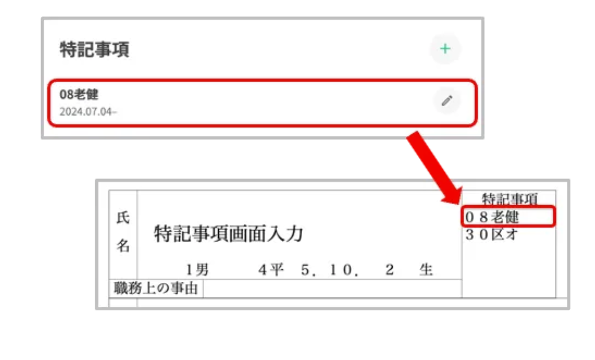 • 「特記事項」に入力した内容がレセプトに反映されます。