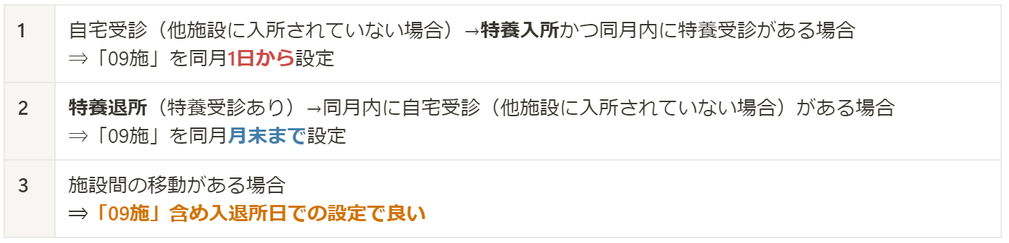 「09施」は、患者の受診場所(自宅・特養)と同月内の受診状況に応じて、設定期間を調整する必要があります。
