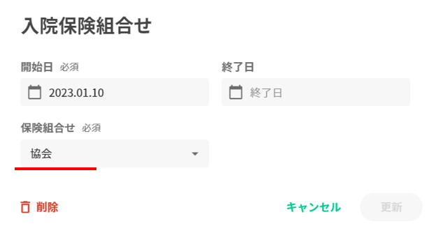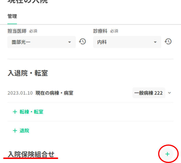 入院管理画面で入院歴が作成されるので、入院保険組合せを設定する