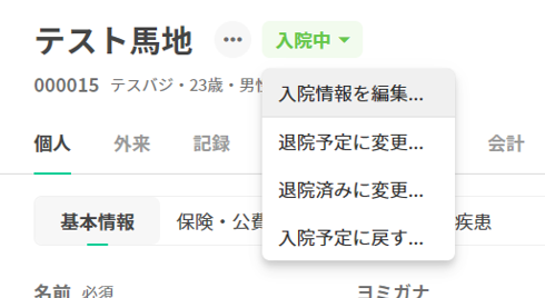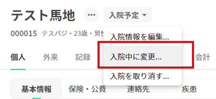 患者情報画面(右)で入院中ボタンを押し「入院情報を編集」を選択