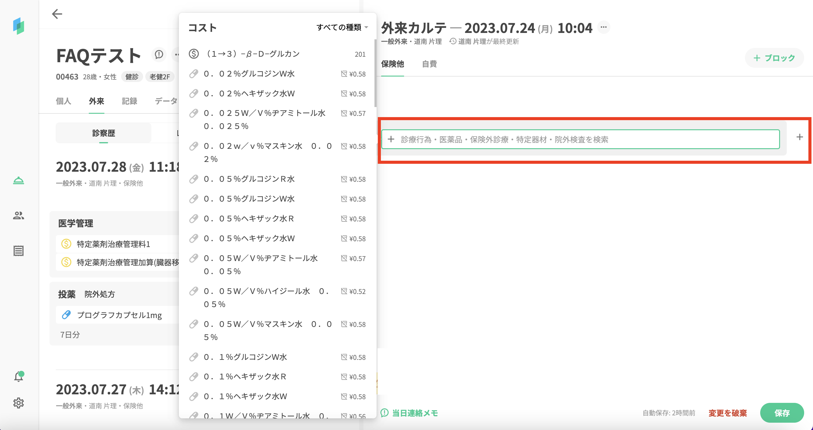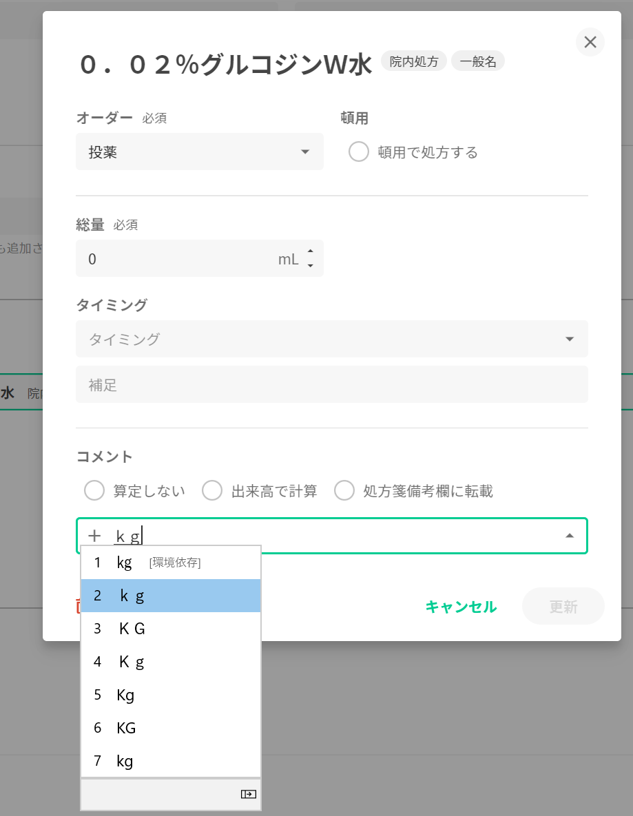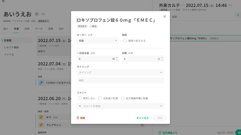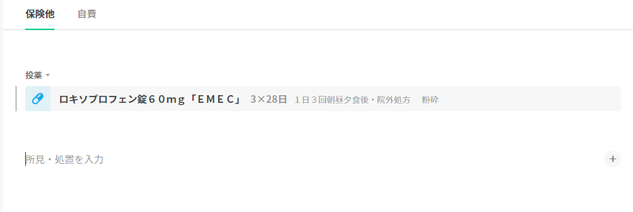 コメント 任意の入力項目です。Henryに登録済みの定型コメントのなかから選ぶことができるほか、フリー入力でコメントを記述することもできます。登録済みの用法は、部分一致による検索ができます。 コメントは複数行追加できます。
