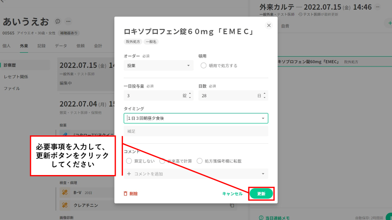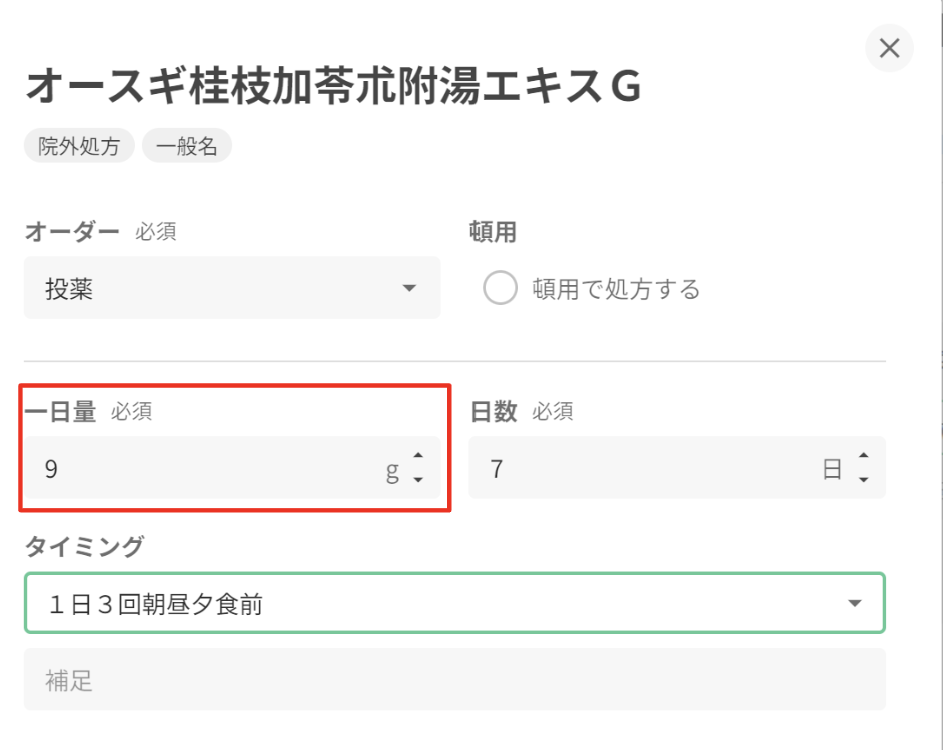 補足 フリーコメントを入力できます。タイミングの選択肢にない任意の用法用量を入力する場合などに使用してください。