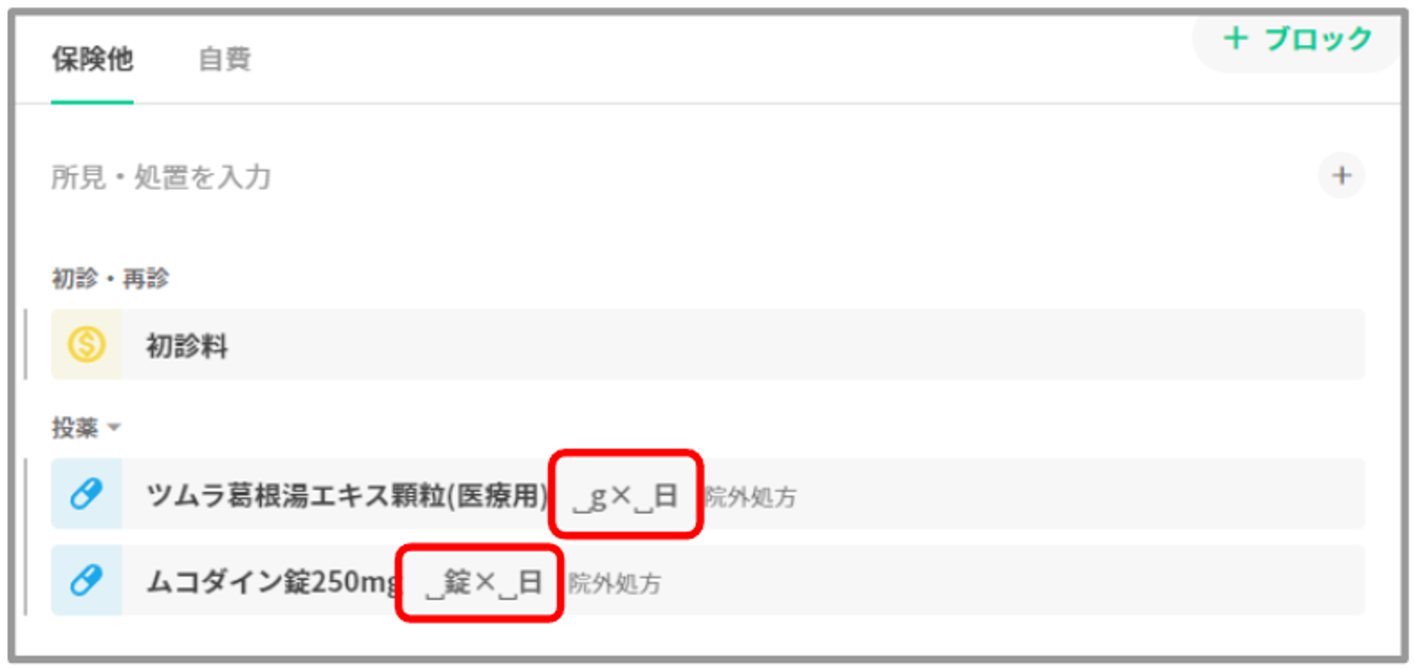 医薬品ブロック上に用法用量が記載されるので、誤りがないか確認できます。修正する場合は、ブロックをクリックすることで編集できます。