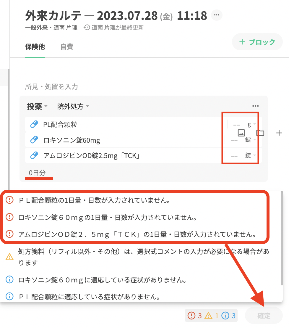 必要項目を入力して「確定」を押下すると、カルテエディタに投薬の医薬品ブロックが追加されます。