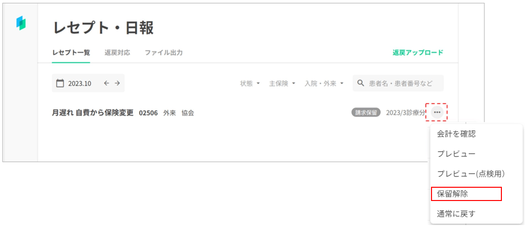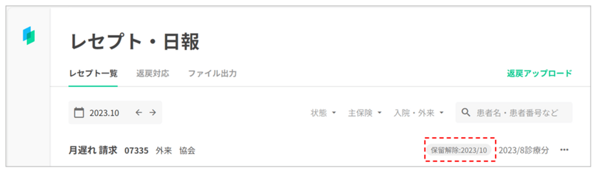 【例】保留解除を行った請求年月が「2023/10」の場合、「保留解除:2023/10」と表示されます。