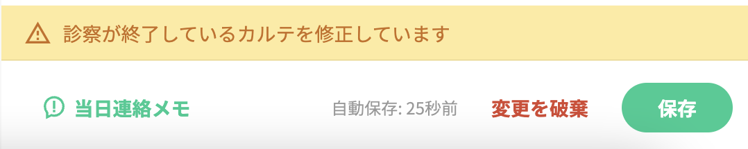 診察が終わったカルテの内容を変更すると、加えた変更の「保存」と「破棄」を選択できるので、行いたい操作を選んでください。