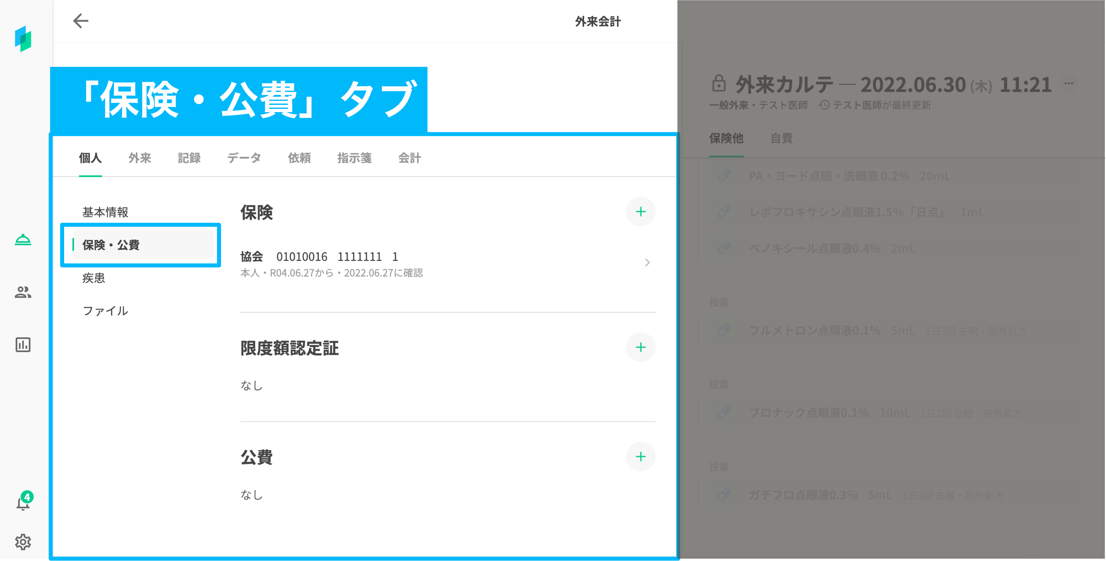 なお、患者が所持している保険証や公費は、患者情報の「個人」>「保険・公費」タブより確認できます。