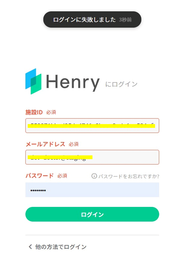 Henryにログインできない場合、Henryのログイン画面の上部に「ログインに失敗しました」と表示されます。