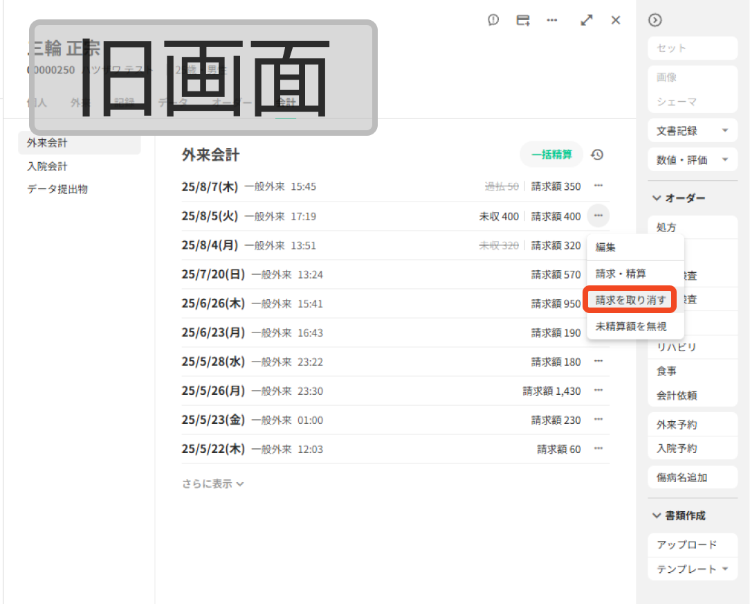 「削除」を選択すると請求が完全に削除され、会計画面に戻ります。