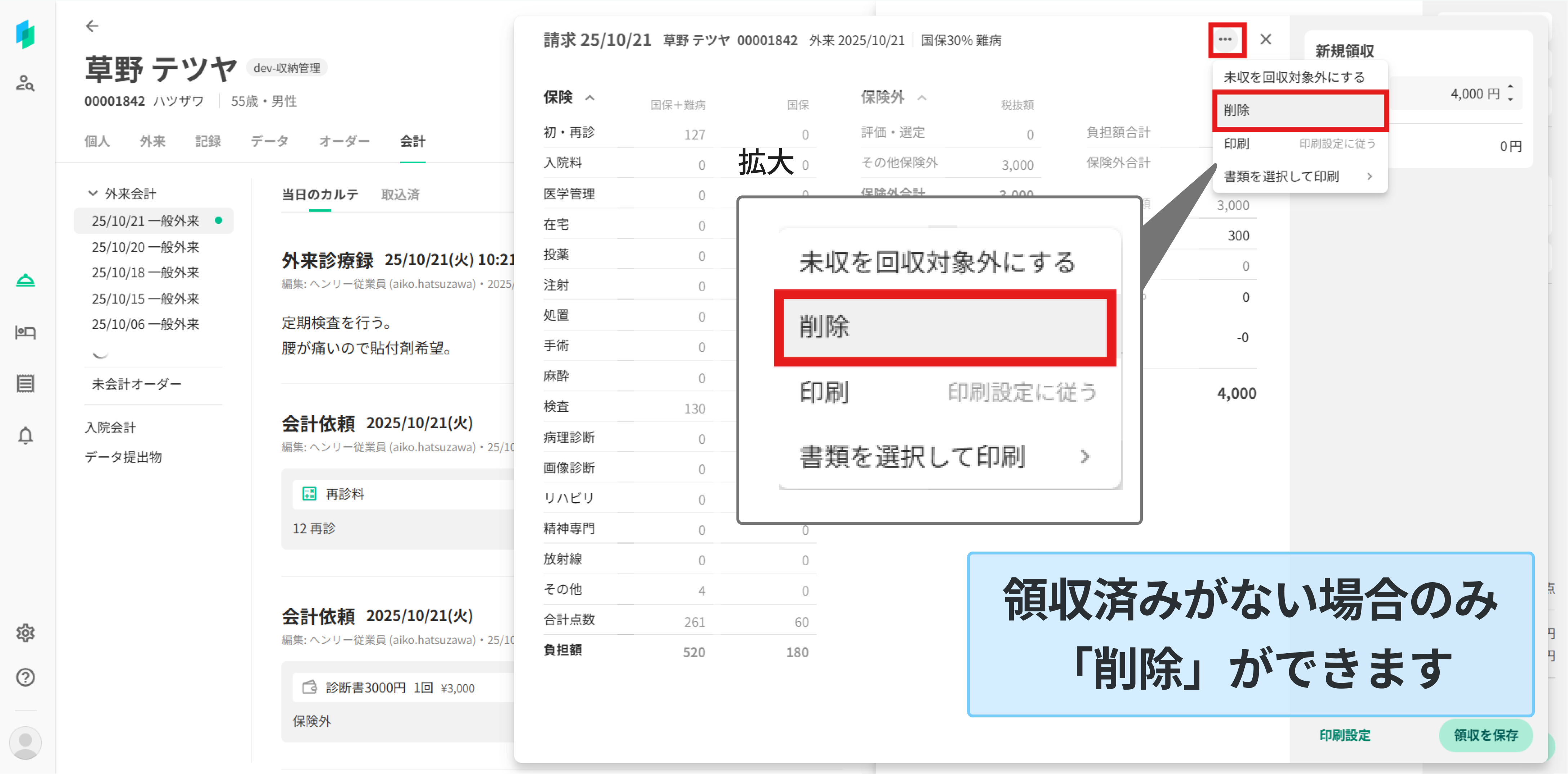 すべての領収記録を削除し、全額未収状態になると、メニューに「削除」が表示されるようになります。
