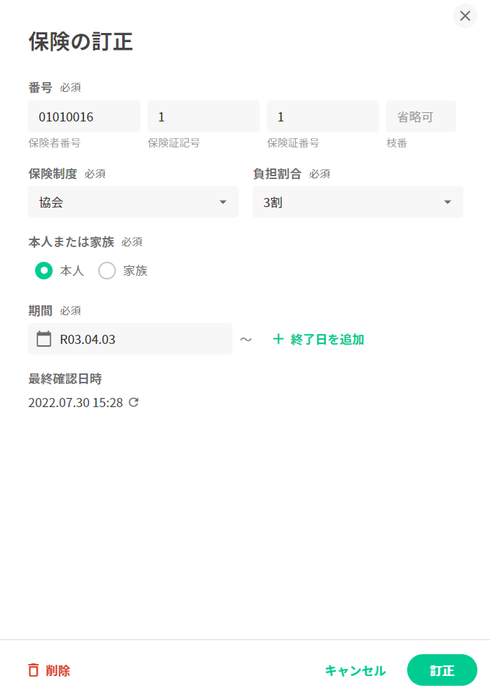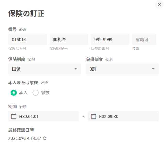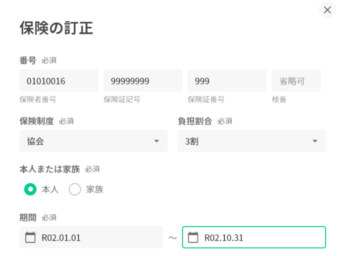 ※運用上カルテに登録されている保険情報の開始日及び期間をお持ちの保険証と合わせる必要がある場合は、既存の保険証を一度終了させ、変更後の割合で保険を新規でご登録ください。