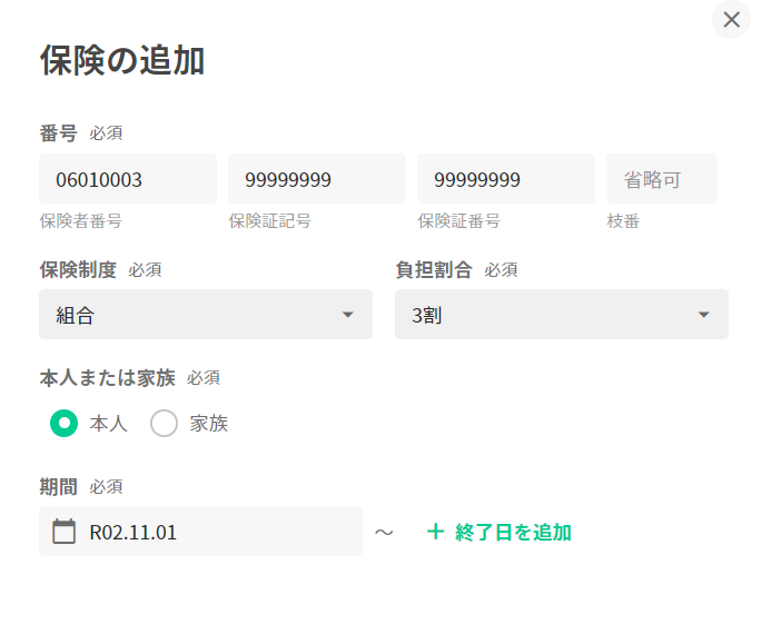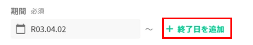 2.医保・公費の場合は「+終了日を追加」をクリックし、「期間」の終了日欄を表示します。