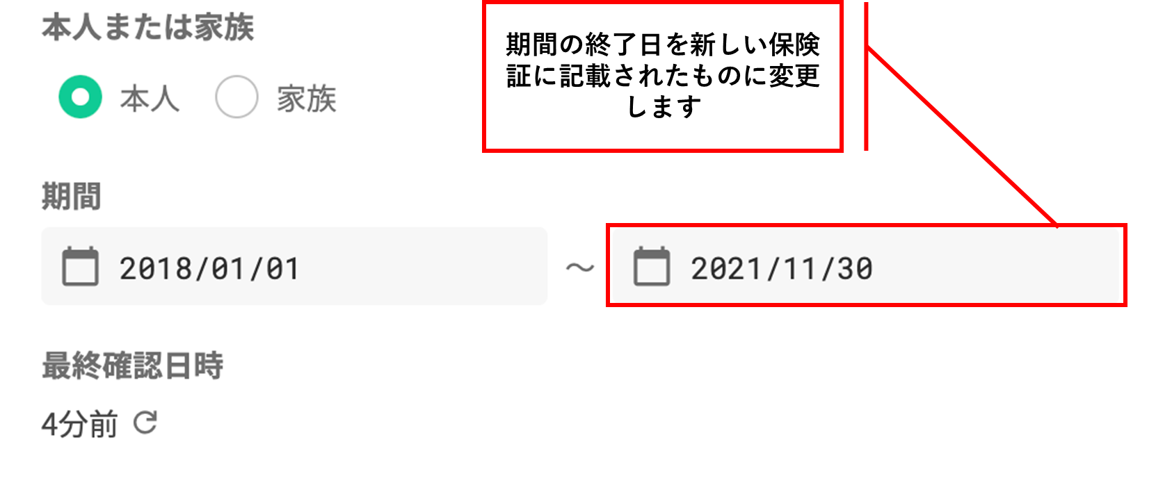 2.「期間」の終了日を保険証原本の有効期限に変更します。