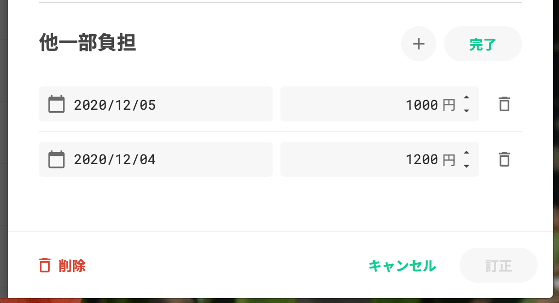 💡 受診日が重複する他一部負担がある場合は、日付欄が赤枠で表示されます。同日に複数負担金登録が可能ですので、日付が重複していても登録内容に問題ない場合は「完了」ボタンを押下してください。