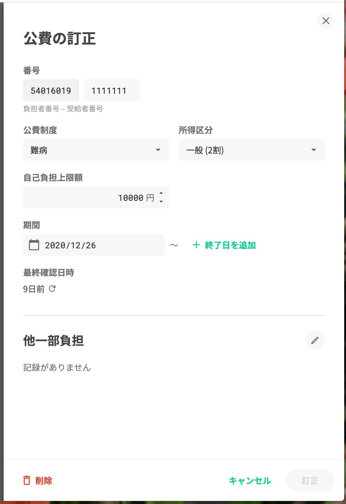 保険情報や公費情報の記号や番号・負担割合など、登録している内容が誤りがあった場合は、その保険情報を訂正します。