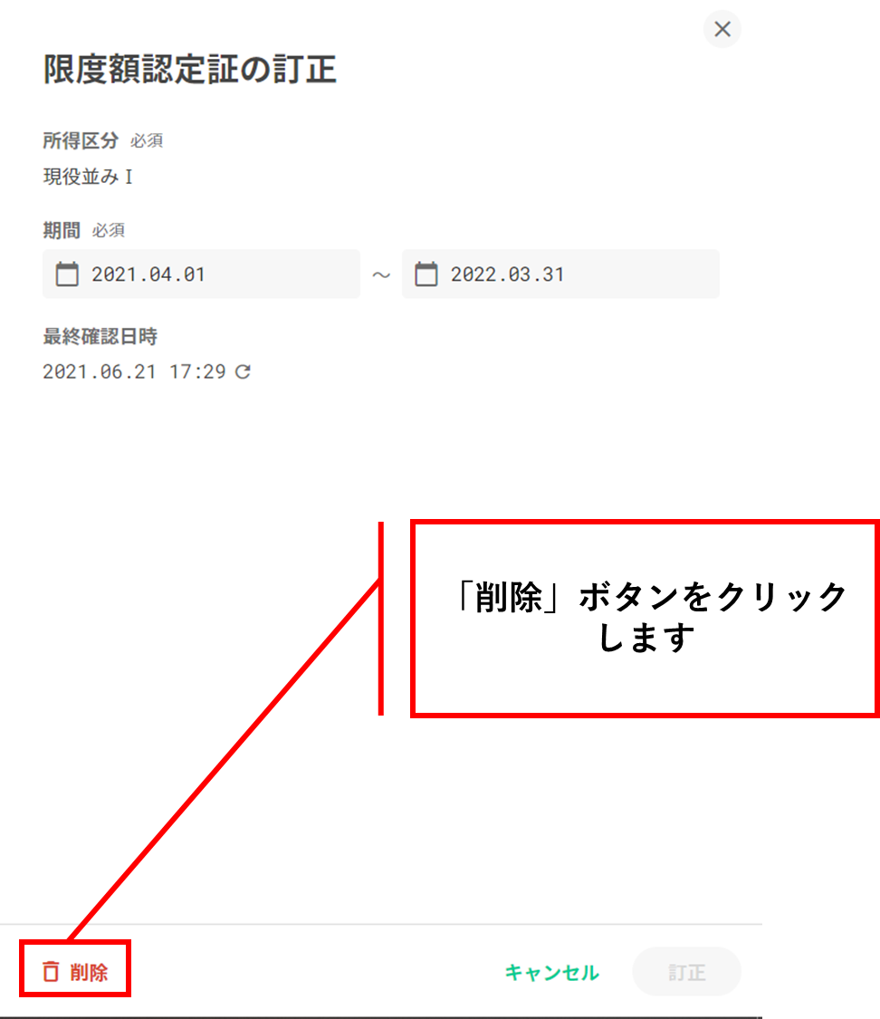 💡 患者が限度額認定証をもっている場合は、限度額認定証も同日で資格喪失させます。 限度額認定証の編集画面を開き、同様の手順で有効期間終了日を変更してください。