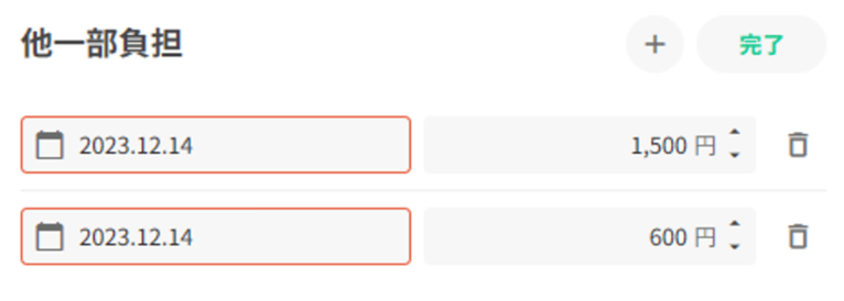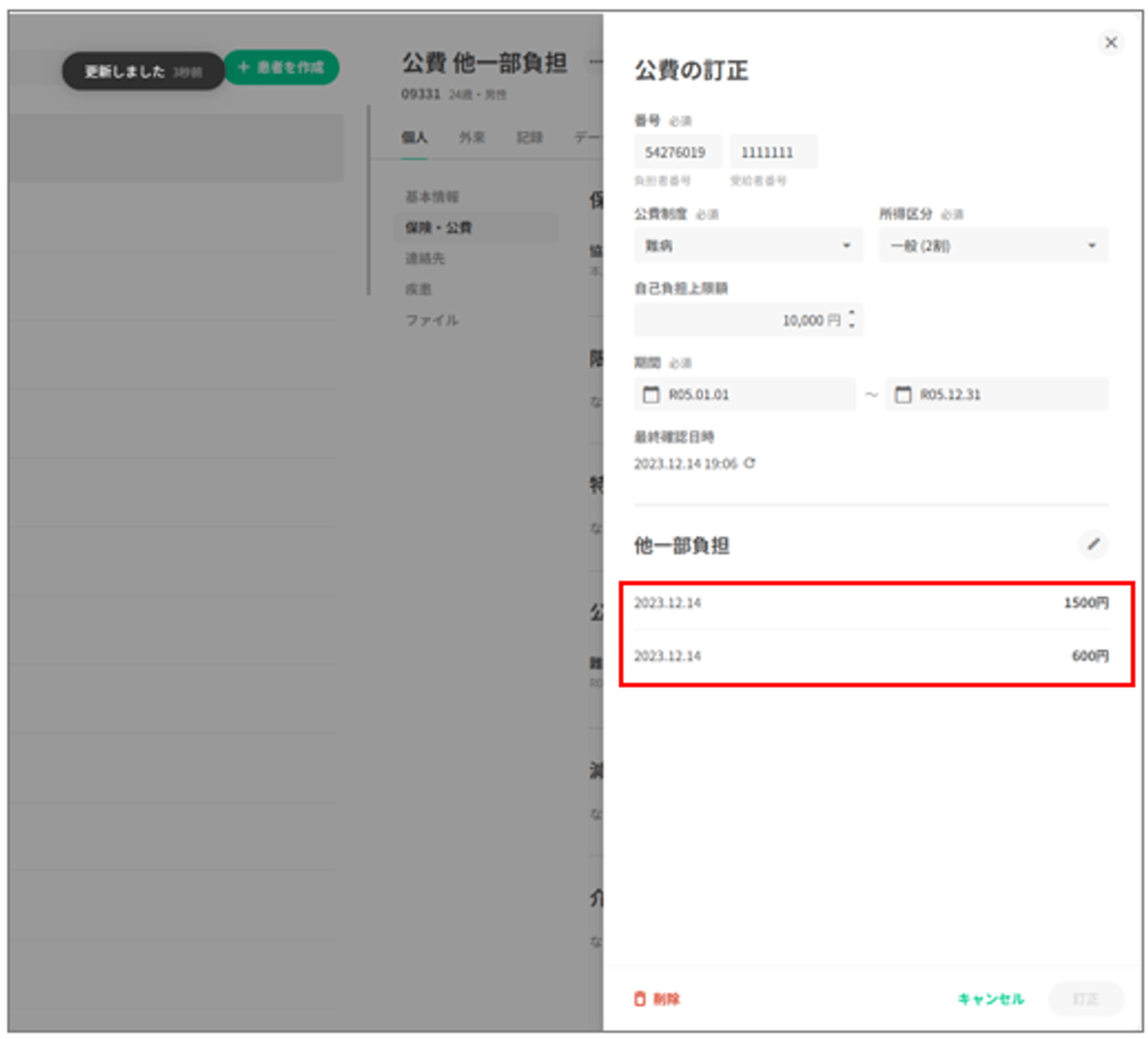 • 他一部負担欄で同日に複数の負担金を入力し、「完了」ボタンを押下すると「更新しました」と表示され、同日で複数の負担金を登録することが可能となりました。