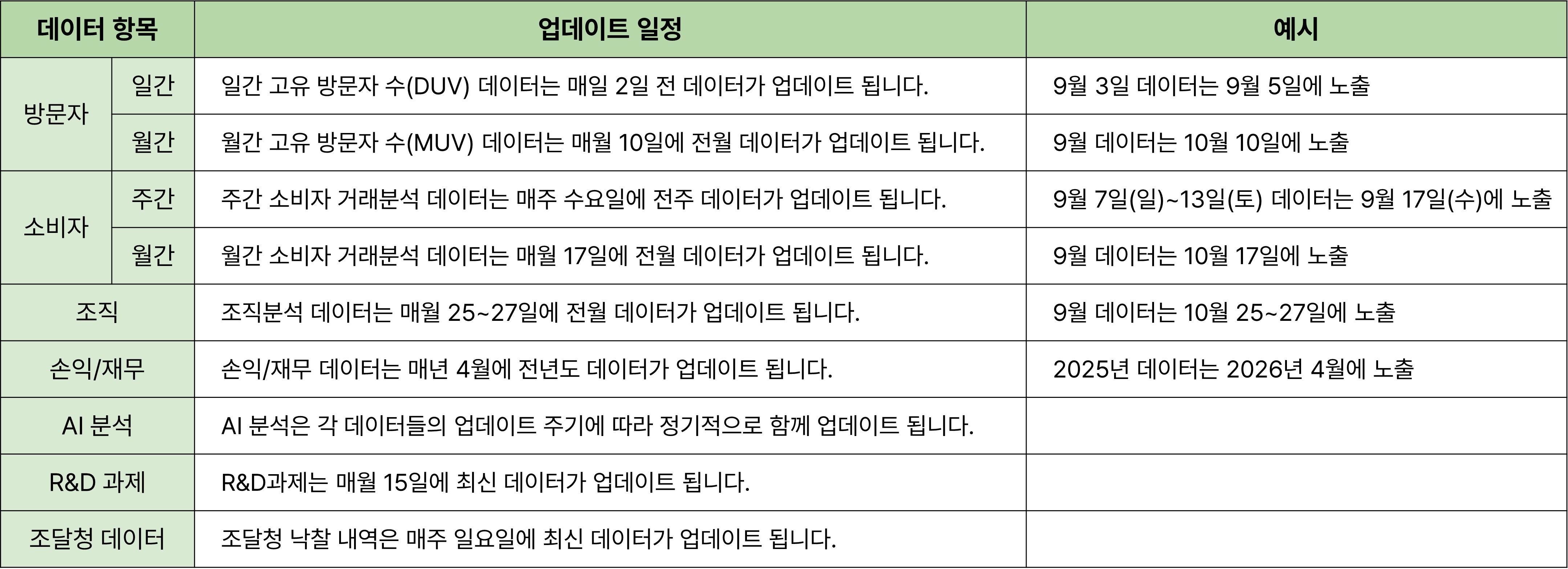 κ·Έ μΈ λ°μ΄ν°λ€μ μλμ κ°μ΄ μ£ΌκΈ°μ μΌλ‘ μ λ°μ΄νΈκ° μ§νλ©λλ€.