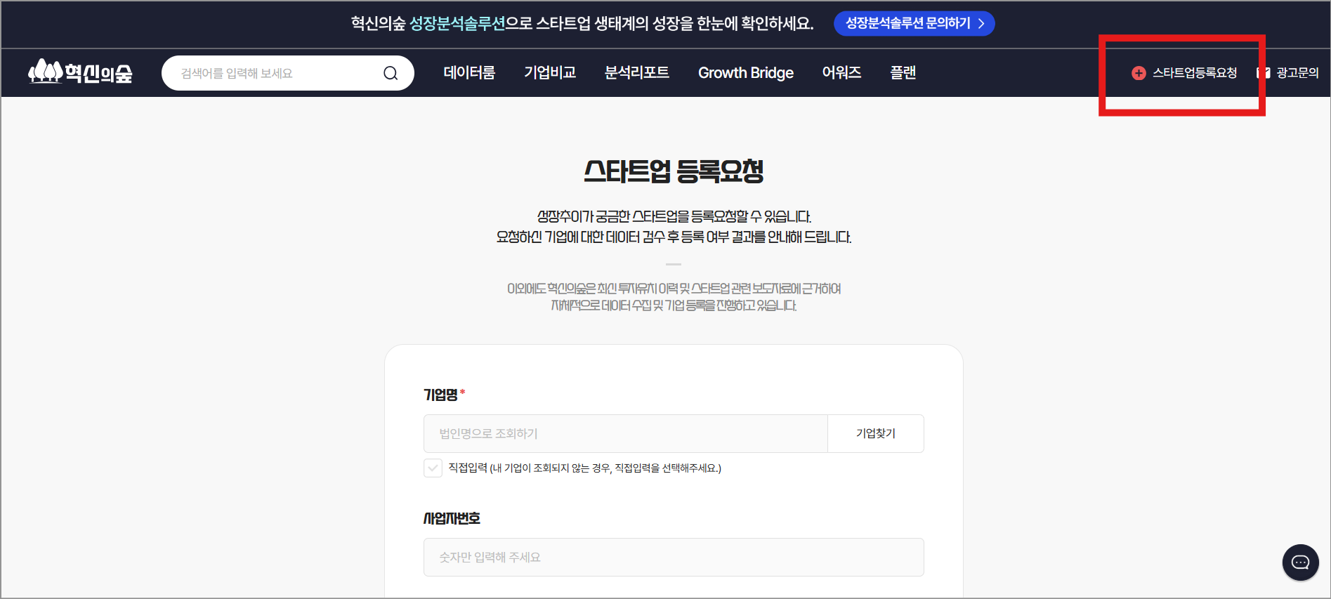 νμ μμ²μ λ±λ‘λμ΄ μμ§ μμ μλ‘μ΄ μ€ννΈμ μ λ°μ΄ν° μ‘°νλ₯Ό ν¬λ§νμλ©΄, νμ μμ² μ°μΈ‘ μλ¨μ [μ€ννΈμ λ±λ‘μμ²] νμ΄μ§μμ μ€ννΈμ λ±λ‘ μμ²μ΄ κ°λ₯ν©λλ€.