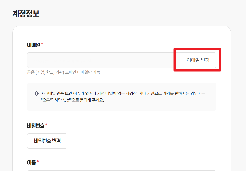 κ³΅μ© λλ©μΈ μ΄λ©μΌμ ν΅ν΄ νμκ°μ μ μ§ννμ κ²½μ°, [κ³μ μ 보] νμ΄μ§μμ κ°μΈλλ©μΈμΌλ‘ μ΄λ©μΌ κ³μ μ λ³κ²½νλ κ²μ λΆκ°ν©λλ€.
