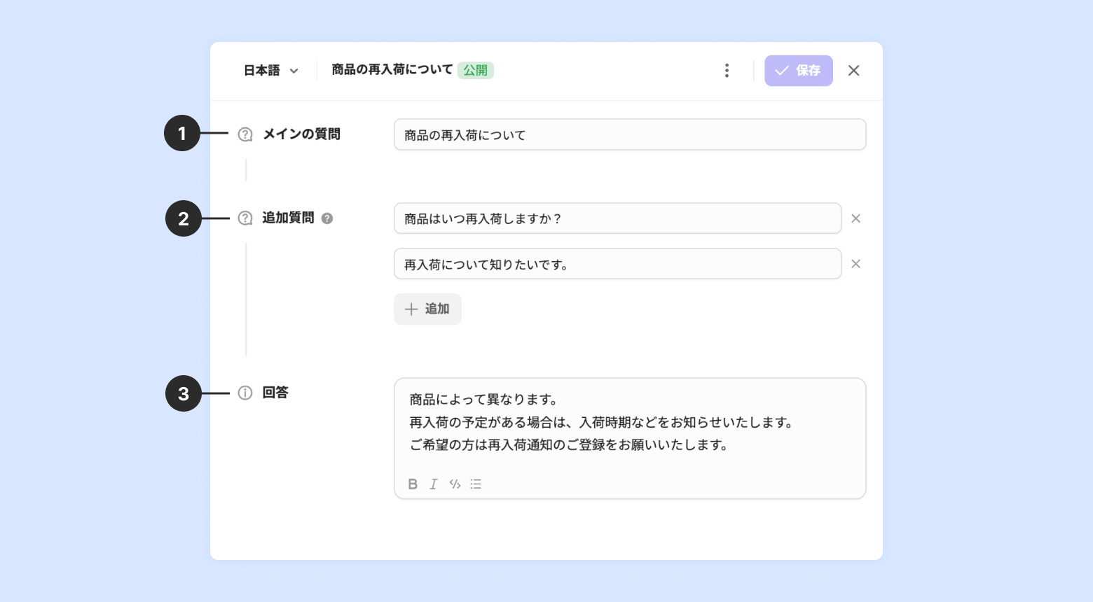 FAQ登録画面で質問は、メインの質問と追加質問に分かれています。メインの質問は自動的にFAQのタイトルになり、ALFが顧客に案内する時にも表示されます。顧客に見える分、分かりやすく表示されても問題ない内容で書いてください。