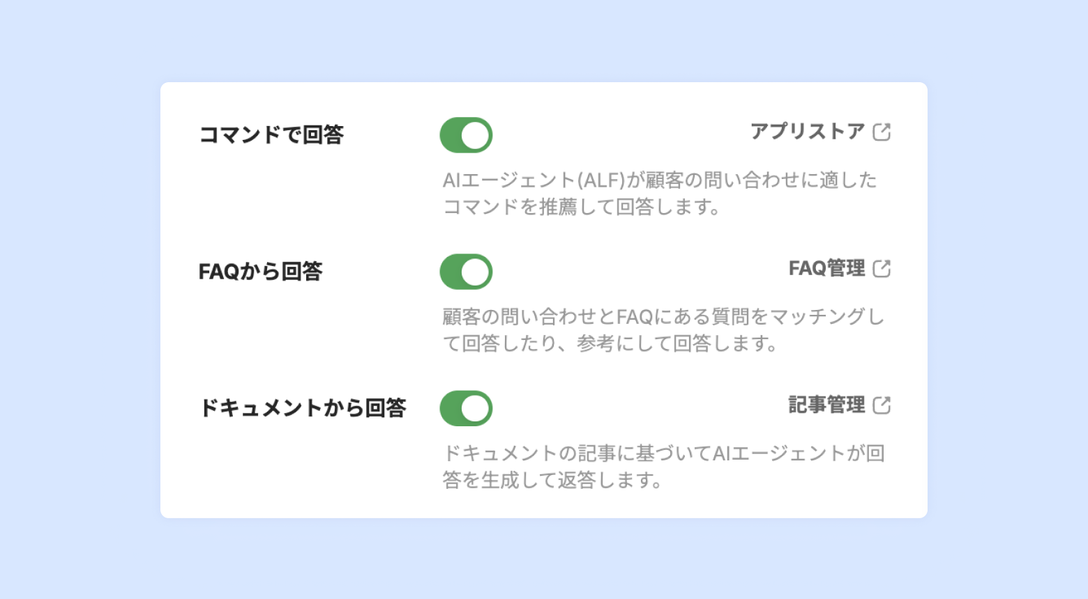[AIタブ] - [設定] - [FAQから回答]、[ドキュメントから回答]がONになっていますか?