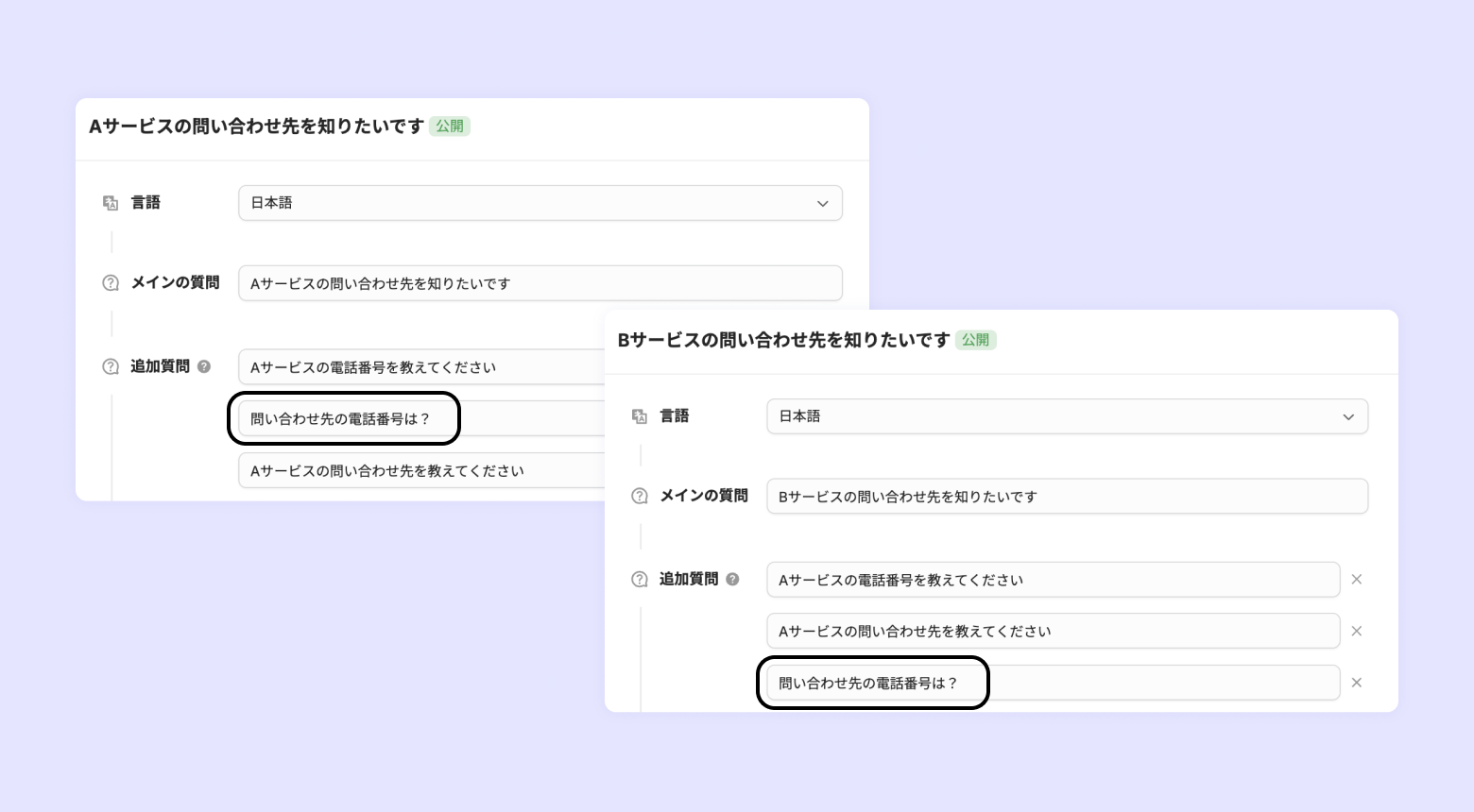 A:FAQが多くなるほど追加質問も多くなり、これによって他のFAQ質問と重なる可能性があるからです。登録した内容からさらに追加したい場合は、既存の追加質問を修正することをおすすめします。