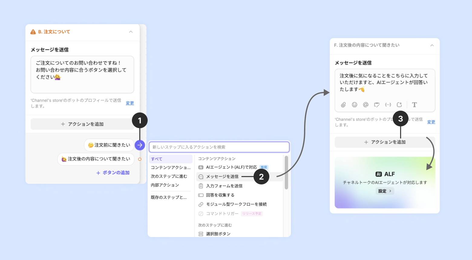 [AIエージェント(ALF)で対応] の上に [メッセージを送信] アクションが設定されている場合は、何か文言を登録していますか?