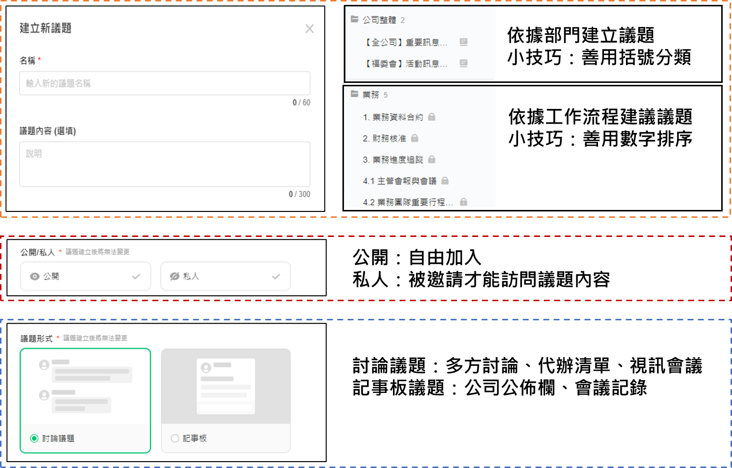選擇適合的權限(公開/私人)與類型(討論/記事板形式),確保協作更高效!