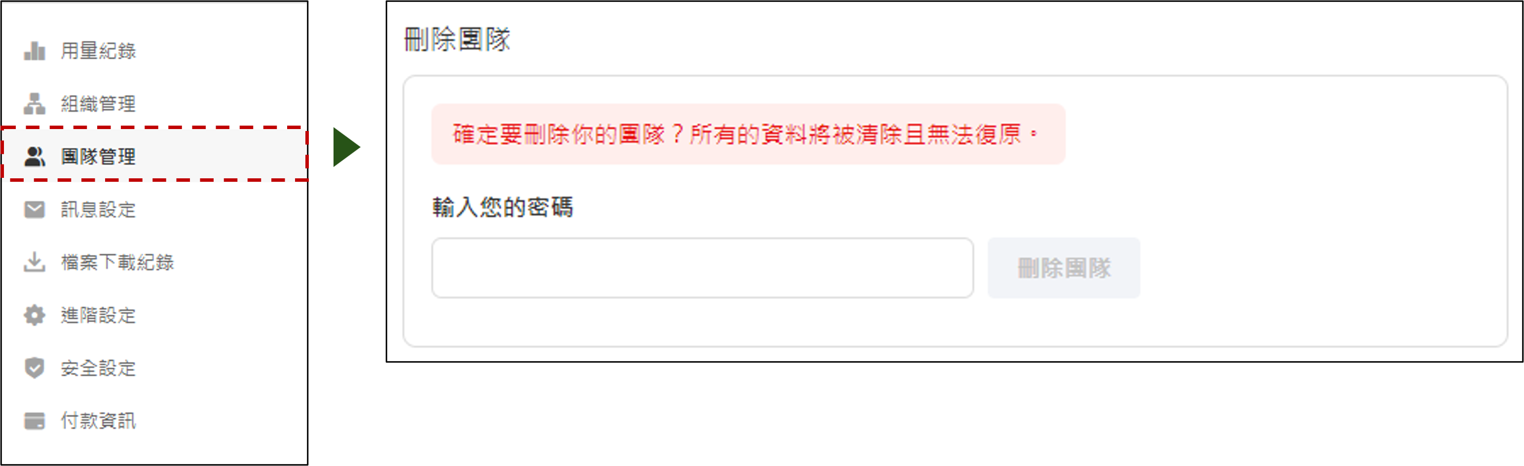 2. 前往 [團隊管理] > [刪除圖隊] > [輸入密碼]。一旦刪除,所有的資料被清除且無法復原!