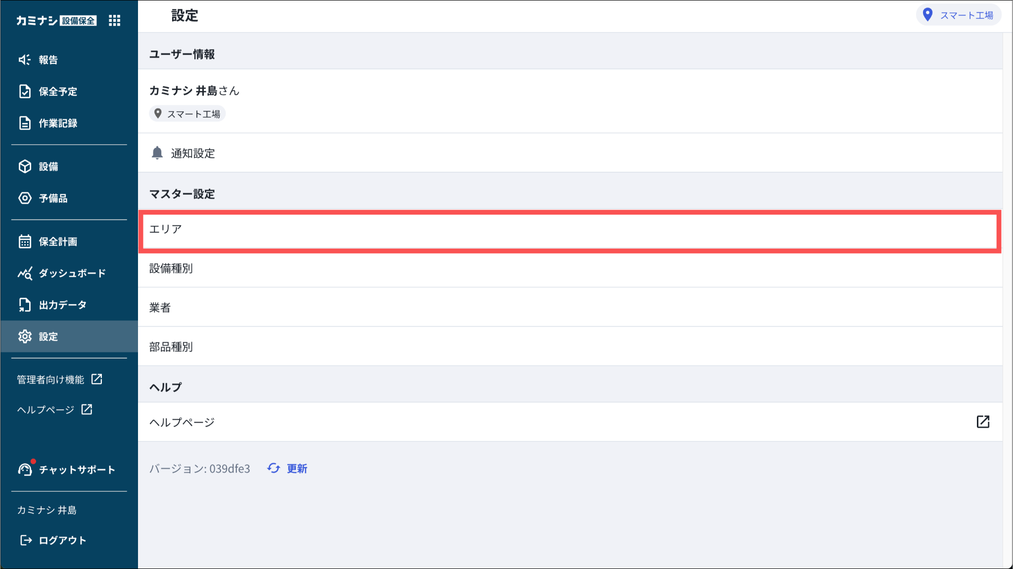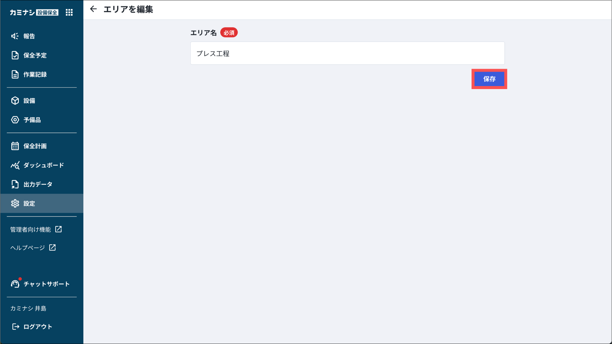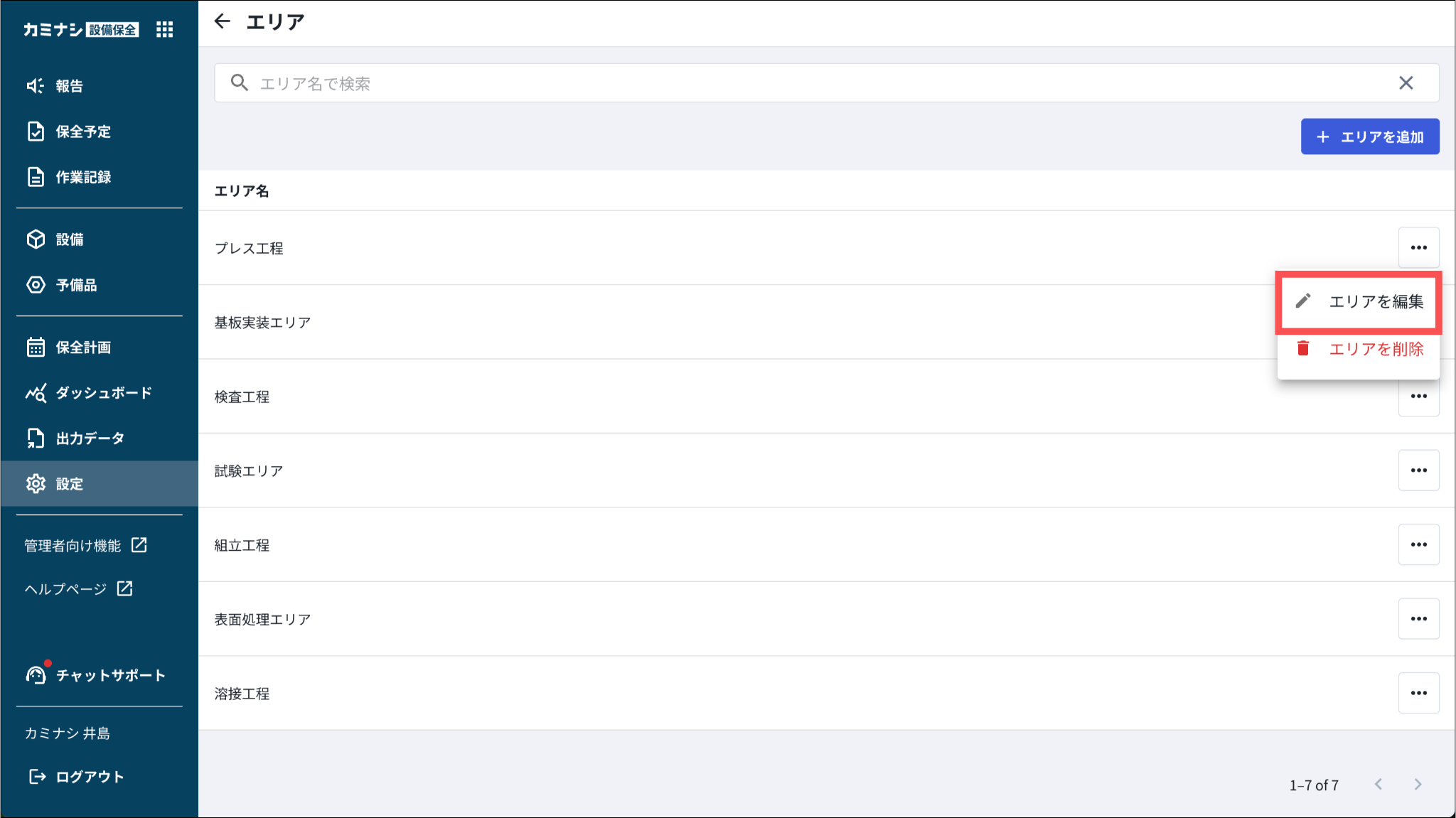 1.カミナシ設備保全にログインする2.「設定」を開き、「エリア」を押す▼モバイル端末の画面画面上部の歯車マークを押すと設定画面を開くことができます。3.編集するエリアの「⋯」を押す4.「エリアを編集」を押す5.エリア名を変更し、「保存」を押すよくある質問は、こちらからご確認ください。