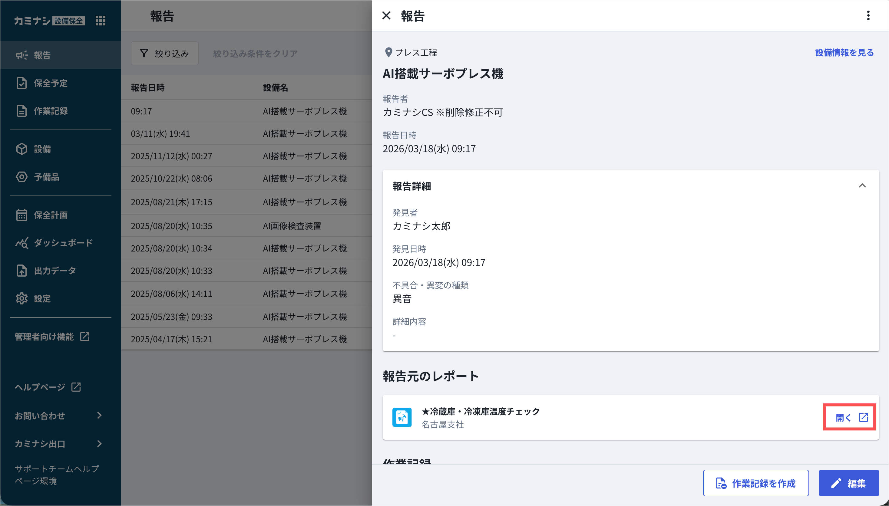 1.カミナシレポート 記録アプリから報告を実施するカミナシレポート 記録アプリから報告を実施する手順は、カミナシレポートヘルプページの以下をご参照ください。記録アプリ(iOS/iPadOS)で設備の不具合報告を実施する記録アプリ(Web)で設備の不具合報告を実施する2.カミナシ設備保全にログインする3.「報告」を開き、対象の報告を押す4.報告内容を確認する「報告元のレポート」の「開く」を押し、レポートの詳細を確認することができます。よくある質問は、こちらからご確認ください。