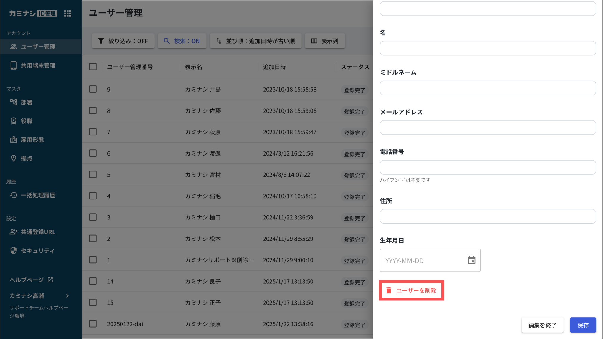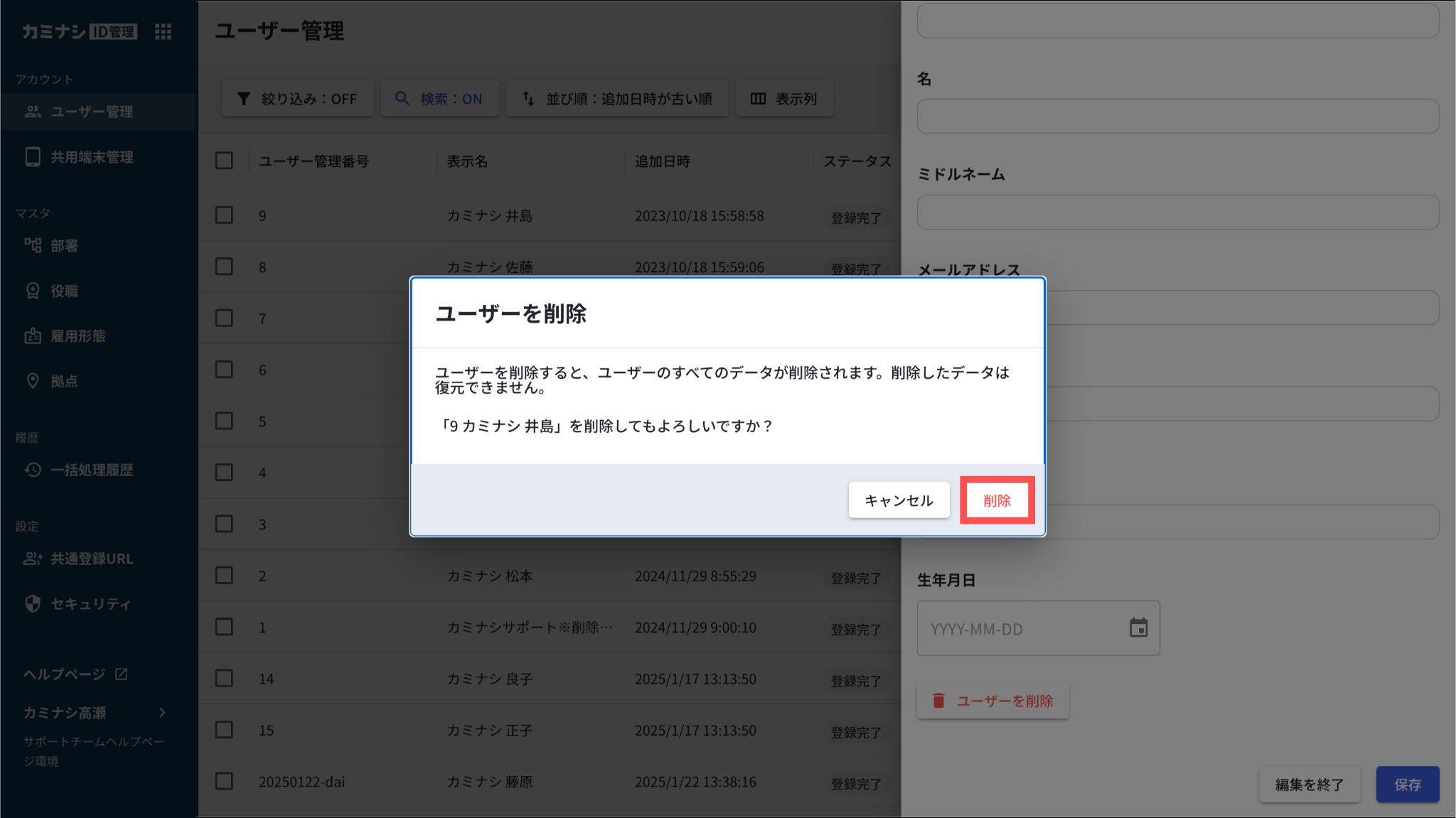 削除されたユーザーは、すぐにカミナシのサービスを利用できなくなり復元できませんのでご注意ください。