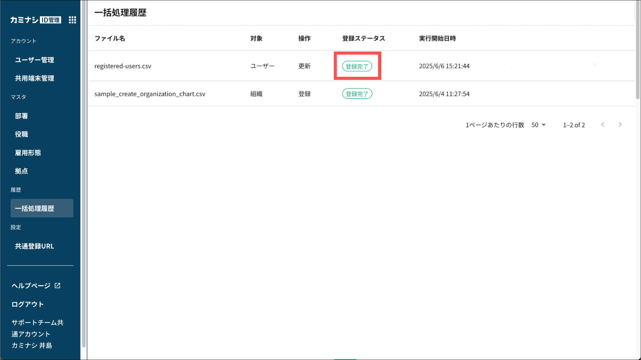 また、処理中は登録ステータスが「実行中」と表示されます。