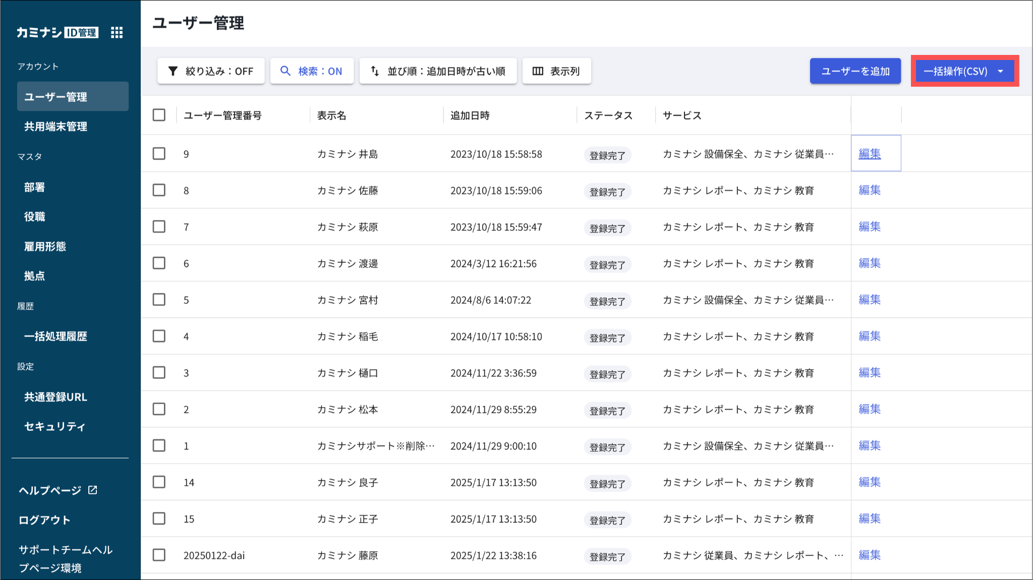 CSVファイルを使った一括編集では、ユーザー管理番号を一括で更新することはできません。