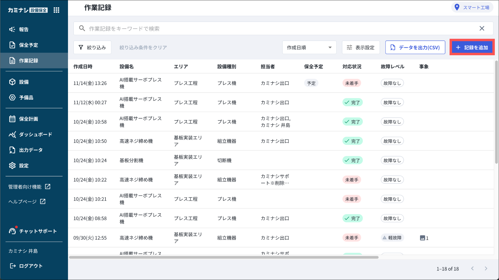 故障や対応によって設備が稼働できなかった時間を記録します。