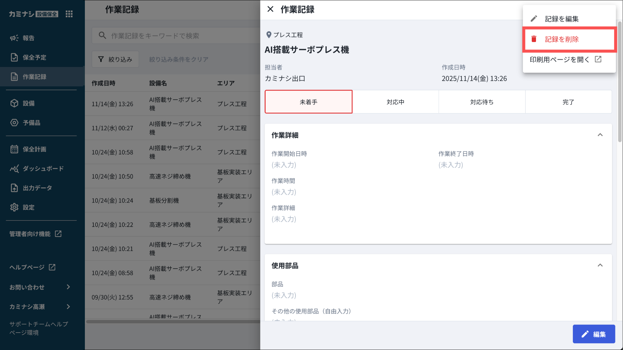 1.カミナシ設備保全にログインする2.「作業記録」を開き、削除する作業記録を押す▼モバイル端末の画面3.「︙」を押す4.「記録を削除」を押す一度削除された作業記録は復元できませんのでご注意ください。よくある質問は、こちらからご確認ください。
