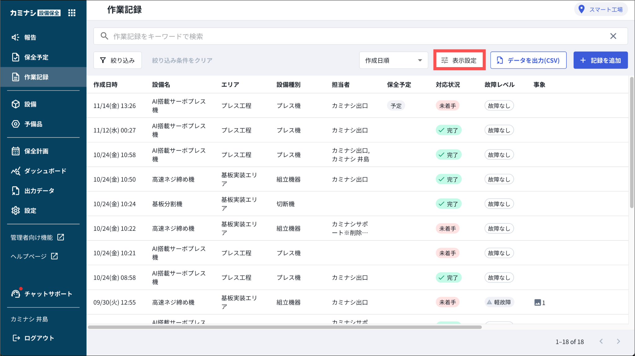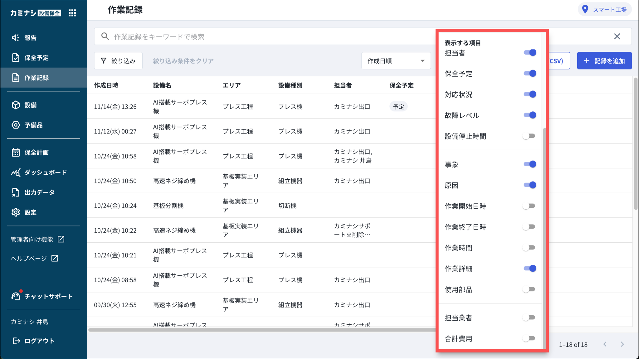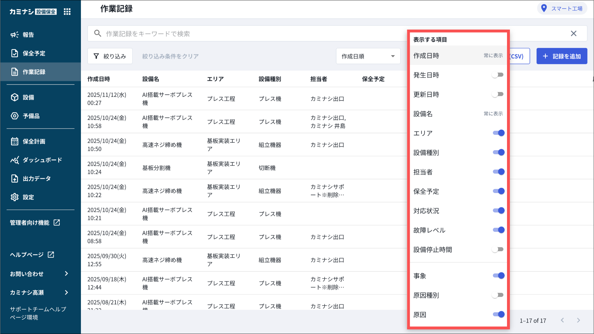 ※作成日時と設備名を非表示にすることはできません。