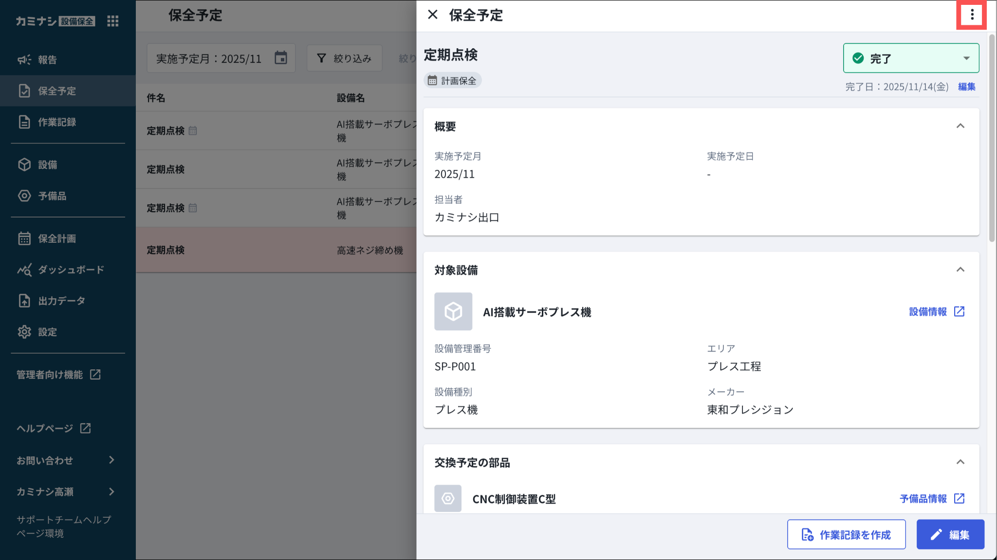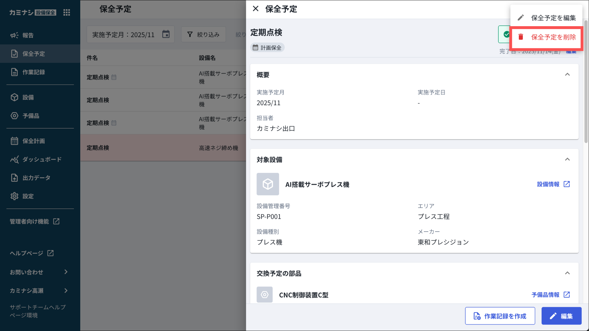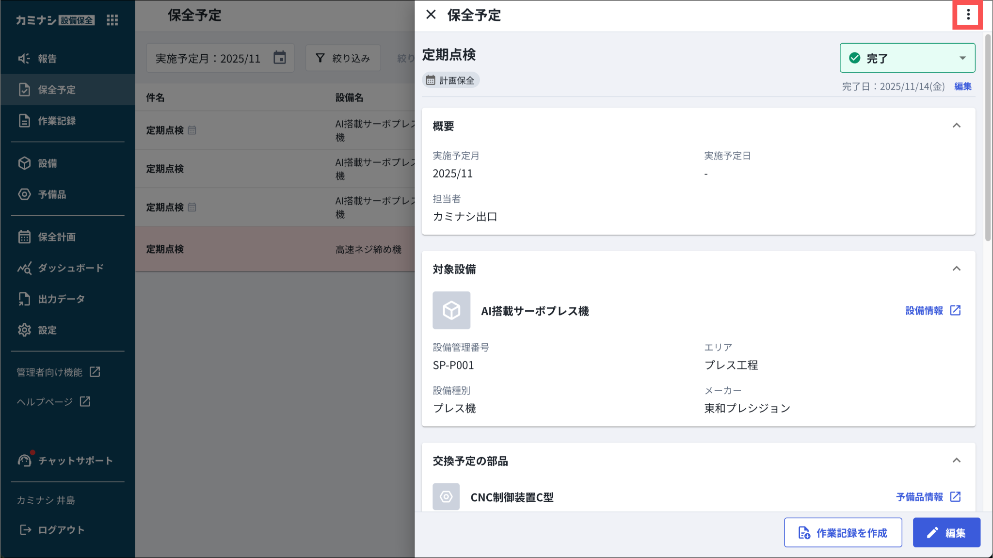 1.カミナシ設備保全にログインする2.「保全予定」を開き、削除する保全予定を押す▼モバイル端末の画面3.「︙」を押す4.「保全予定を削除」を押す一度削除された保全予定は復元できませんのでご注意ください。よくある質問は、こちらからご確認ください。