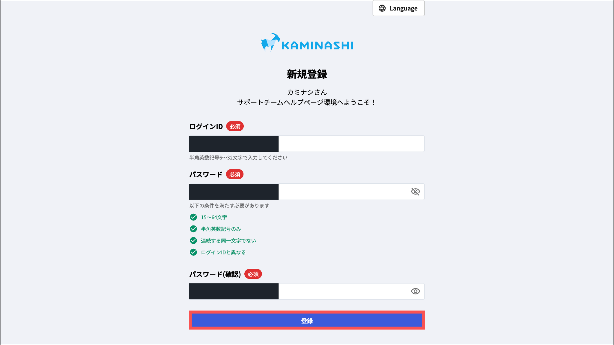パスワードは画面に表示されたポリシーに準拠した文字数、文字種を使用してください。