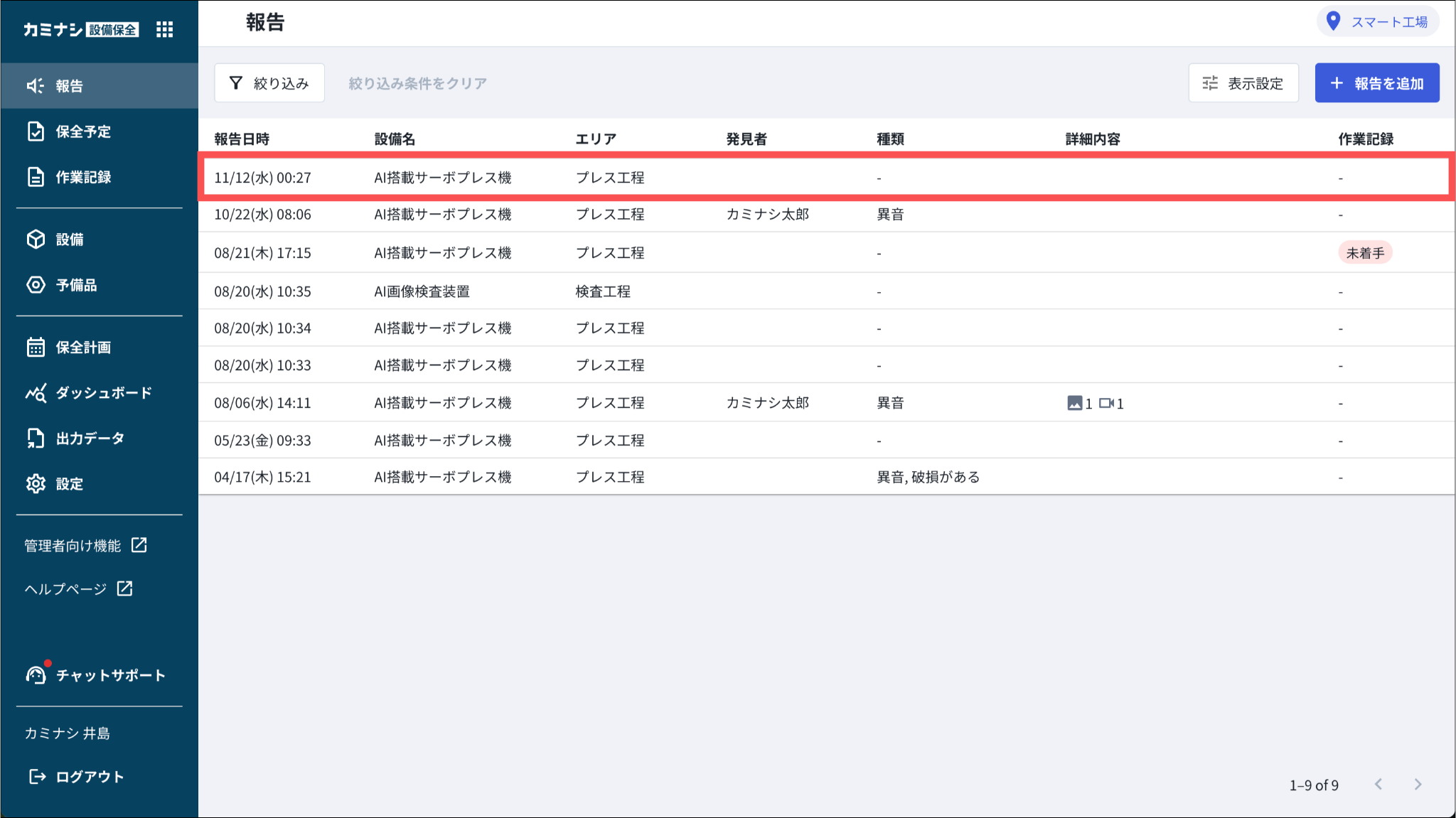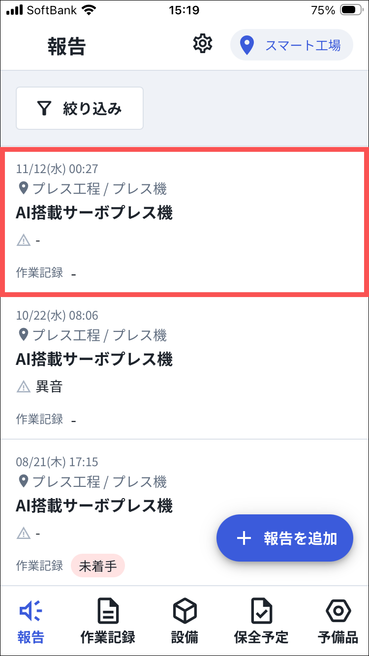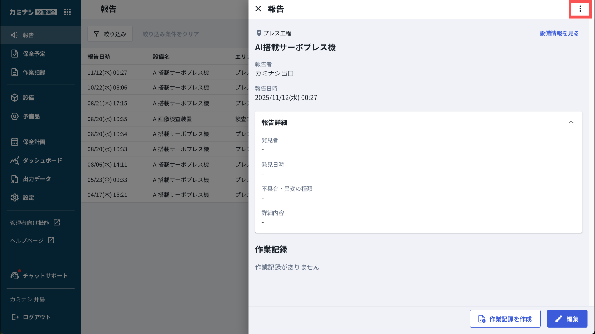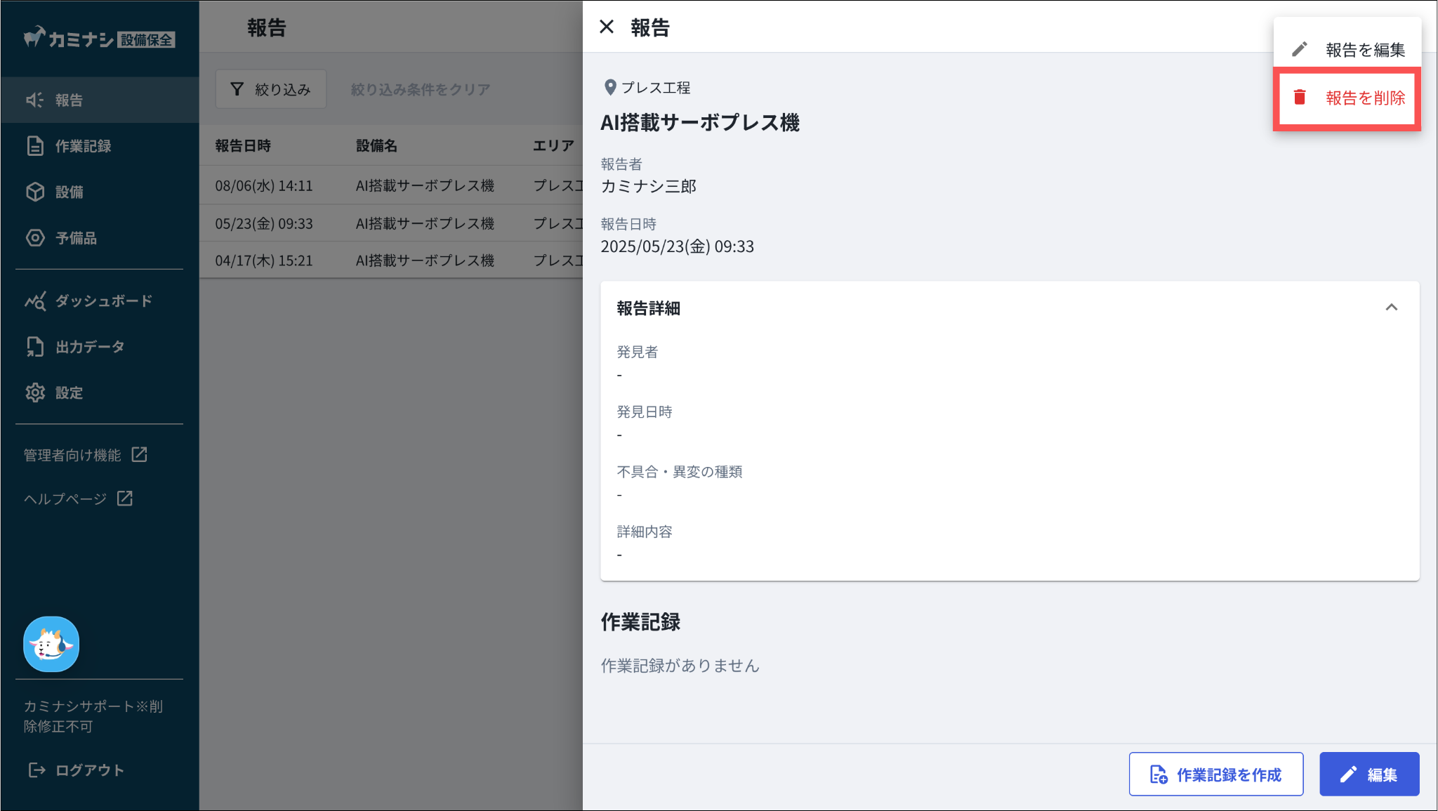1.カミナシ設備保全にログインする2.「報告」を開き、削除する報告を押す▼モバイル端末の画面3.「︙」を押す4.「報告を削除」を押す一度削除された報告は復元できませんのでご注意ください。よくある質問は、こちらからご確認ください。