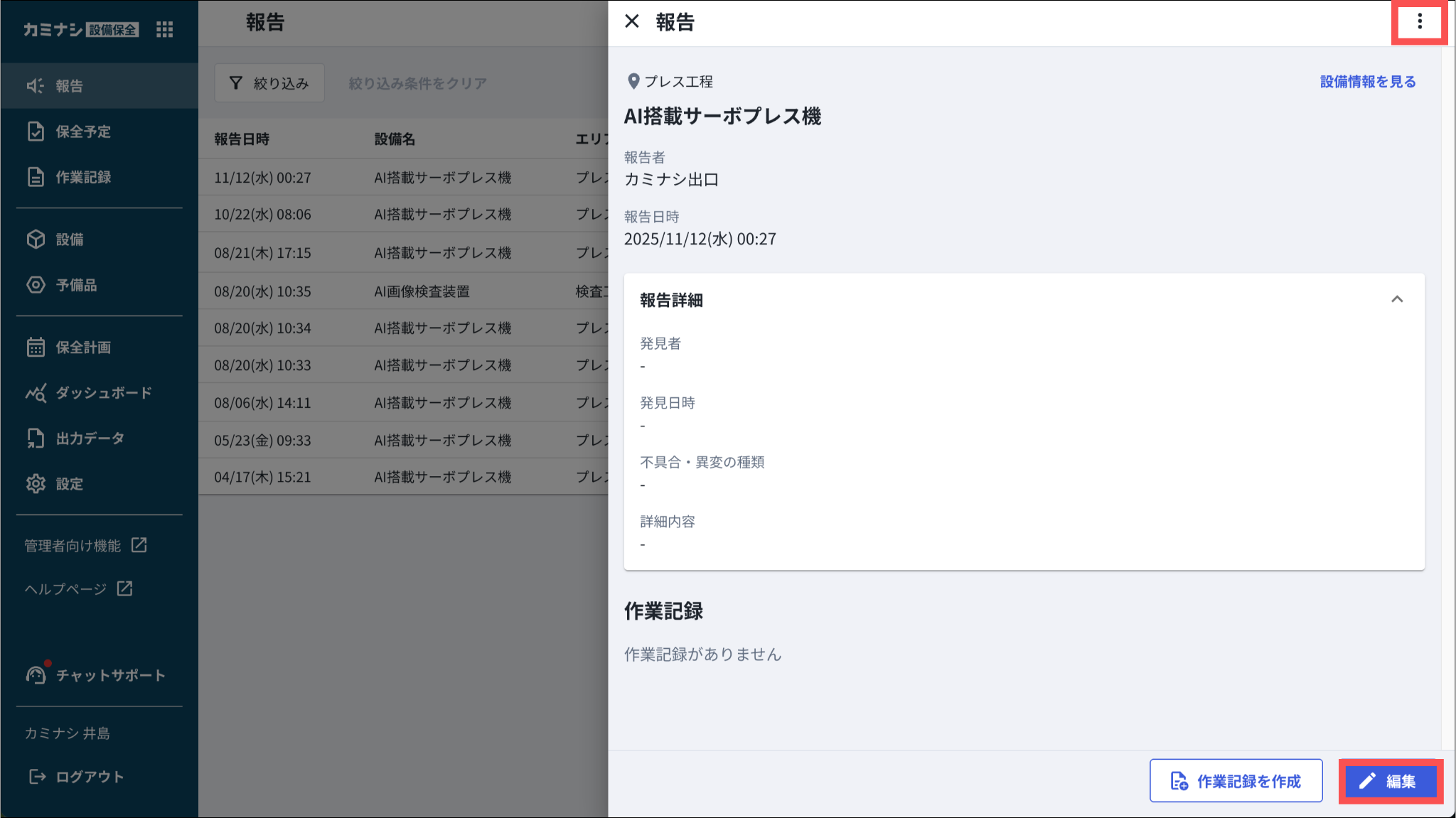 1.カミナシ設備保全にログインする2.「報告」を開き、編集する報告を押す▼モバイル端末の画面3.画面右上の「︙」、または「編集」を押す「⋮」を押した場合は、次に「報告を編集」を押します。4.内容を修正し、「保存」を押すよくある質問は、こちらからご確認ください。